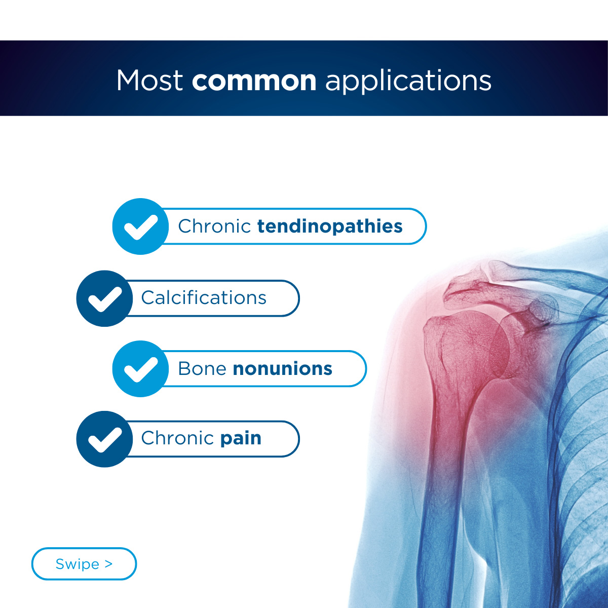 - Behandlung von z.B. Fersensporn, Plantarfasziitis, Epicondylitis, Frozen Shoulder, Myofaszialen Triggerpunkten, Trochanter Major Schmerzsyndrom, Patellaspitzensyndrom, Muskelverhärtungen und mehr.